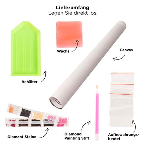 Diamond painting starter set: bevat ronde stenen, perfect voor de startende diamond painters. De steentjes zijn gemakkelijk te pakken en plakken. De afmeting van het canvas is 40 x 50 cm. Het is een leuke hobby en kan zelfs stress helpen verminderen.