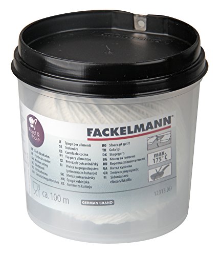 Keukengereedschap: Je ontvangt 100 m speciaal garen (ca. 1-1,5 mm) in een koord-box (ca. 6,5 x 5 x 6,5 cm) met snijmachine uit het keuken-assortiment van Fackelmann. Deze robuuste keuken-gadget is hittebestendig tot 175 °C.