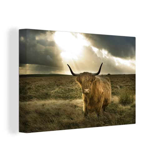MuchoWow Canvas Schilderij Decoratie – 120×80 cm – Schotse hooglander – Zon – Gras – Wanddecoratie Muurdecoratie…